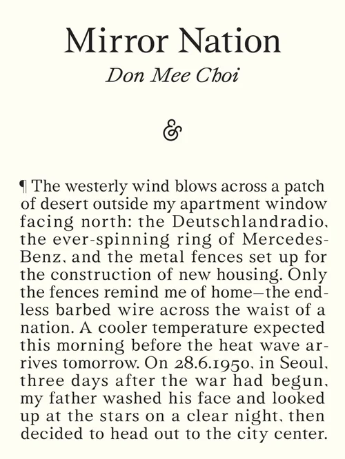 ‘Choi, at the end of Mirror Nation, understands that she, too, is a divided country, a political person and a family person, one person who is consumed with history and grief and another person who stops to marvel at sparrows and swans.’